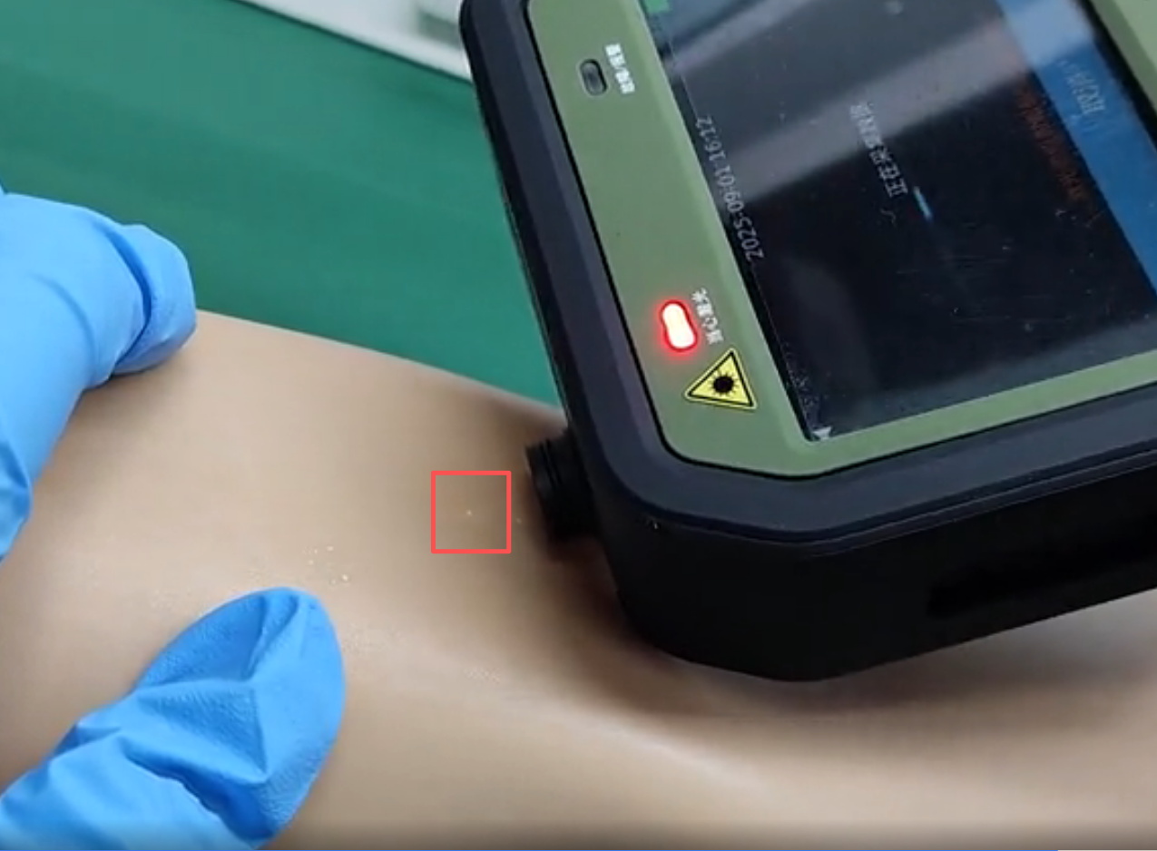 ②将分析仪的激光探头对准样品液滴进行检测。注意激光光斑需要准确打在样品表面中心位置,激光探头与模拟剂表面距离保持约5-7 mm的距离,测试过程中仪器与样品需要保持相对静止。