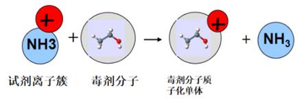 当含有化学毒剂分子(M)和复杂环境干扰物的空气样本进入电离区后,它们将与新建立的NH₄⁺反应离子相遇。对化学毒剂(如沙林、维埃克斯等):这些分子的质子亲和能极高(通常> 900 kJ/mol),远高于氨气。因此,它们能轻易地从NH₄⁺手中“夺走”质子,发生质子转移反应,生成稳定、特征明显的质子化毒剂离子(MH⁺):NH₄⁺ + M → MH⁺ + NH₃。