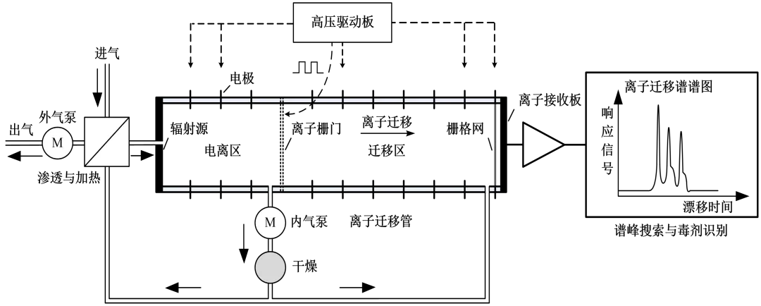 离子迁移谱仪的典型结构包括采样与进样系统、离子迁移管、载气和迁移气体循环系统、离子门控制系统、高压电源系统、温度加热控制电路、信号放大采集和数据处理系统。