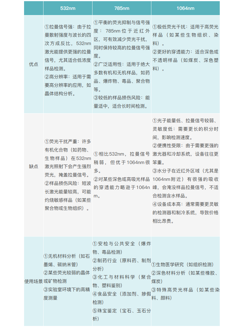 目前市面上主流的手持式拉曼光谱仪激光波长主要包括下面三种:532nm、785nm和1064nm
